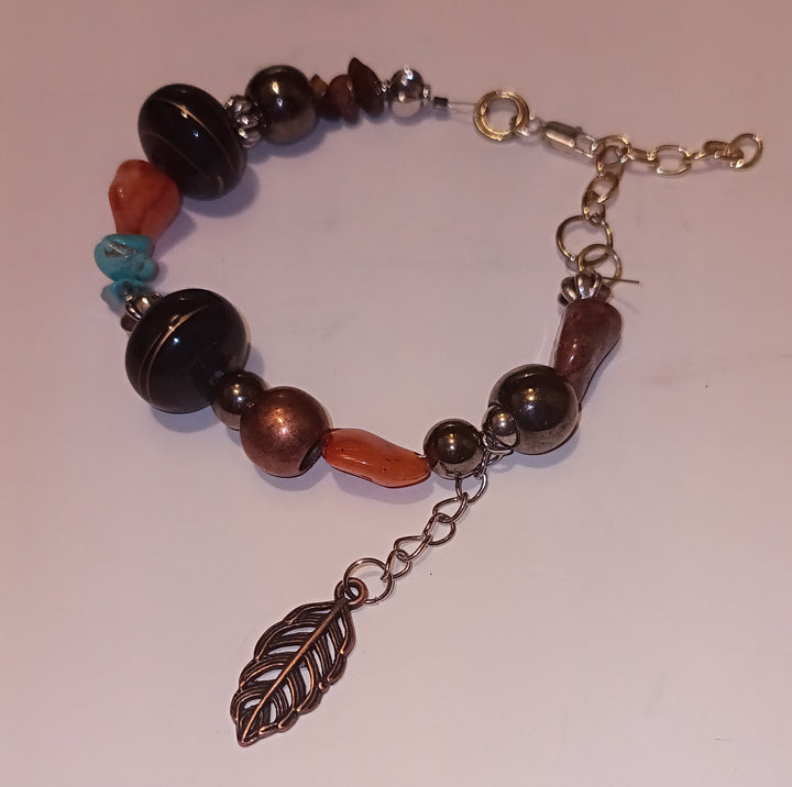 It also has a copper leaf charm, and a extender chain on there to adjust bracelet to different sizes.