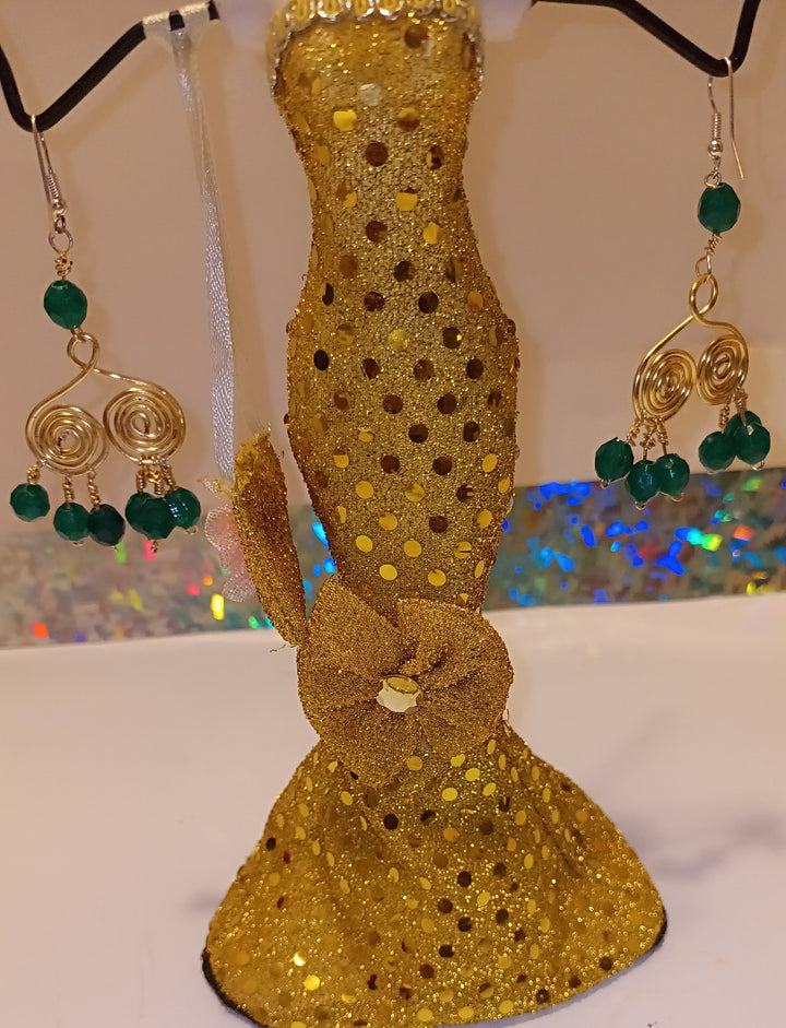These are spiral earrings made with acrylic beads, and made with gold tone copper wire.