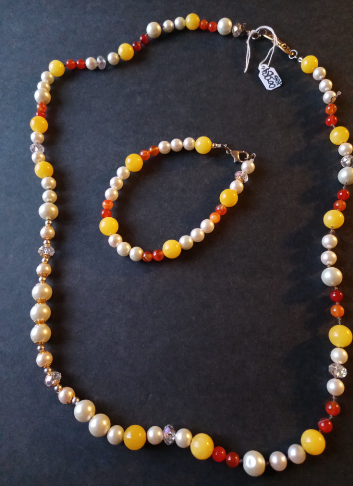 This is a pearl necklace set and it is made with freshwater pearls, and yellow, orange agate gemstones.  And it's made on a stainless steel wire.